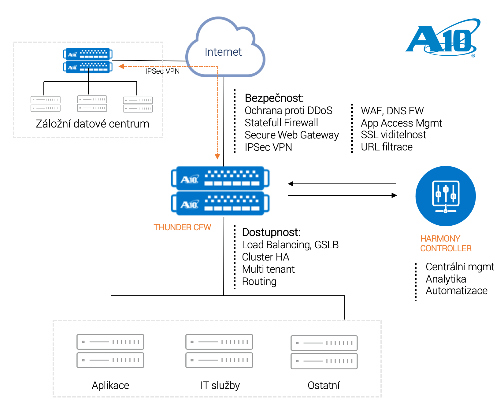 Konvergovaný firewall A10 Thunder doplňuje již uvedené funkce o stavový firewall, webovou bránu a site-to-site IP VPN pro zabezpečení spojení mezi datovými centry. CFW lze nasadit také jako hraniční firewall a směrovač před datové centrum, a tím zde dále optimalizovat místo v racích.